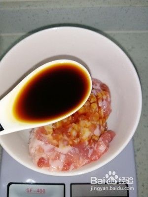 按方子中比例放入调料腌肉馅,搅上劲,腌10分钟。