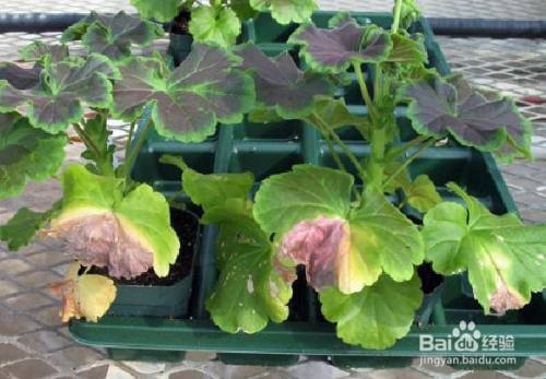 叶边缘为棕色的天竺葵最常见的问题是缺水。绿色组织和棕色组织之间叶片的泛黄现象称为萎黄病或缺氮。也表明了铁/锰的过量,这会在土壤的pH值太低(酸性)时发生。