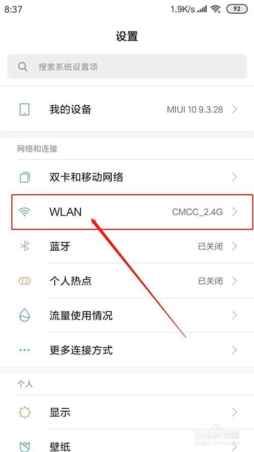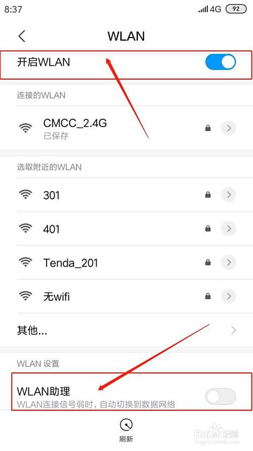 在“WLAN”的界面中,打开“开启WLAN”和“WLAN助理”的勾选开关,连接稳定的WIFI网络。