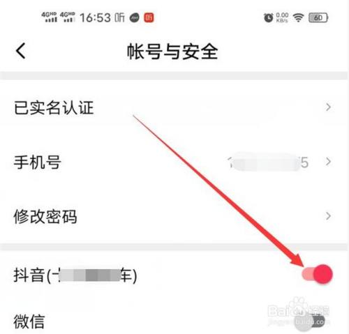 在“帐号与安全”窗口中,点击“抖音”选项后的【开关】图标。