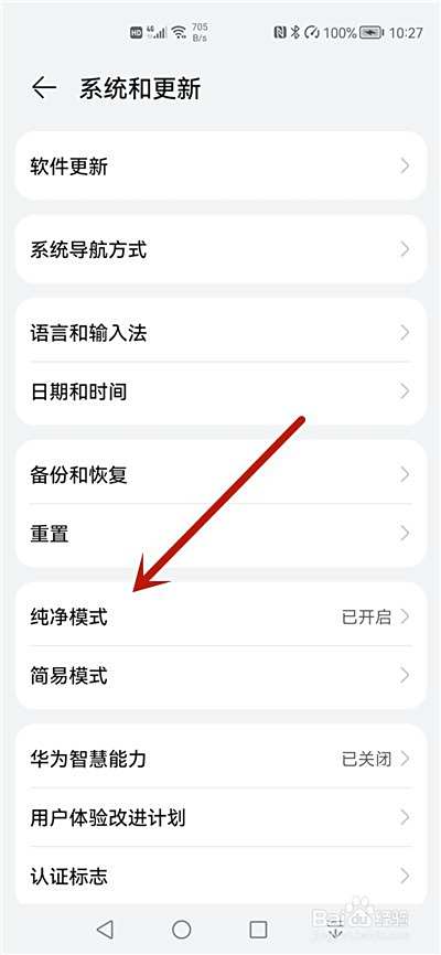 在华为手机系统和更新选项中,进入到纯净模式界面,在里面将纯净模式关闭掉,就能成功解决此问题。