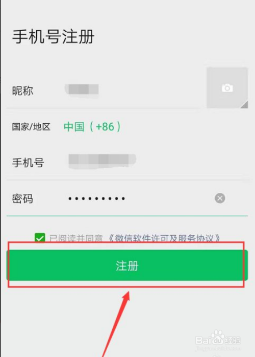 进入注册的详细页面,输入【昵称】【手机号】【密码】此海随,点击注册按钮。