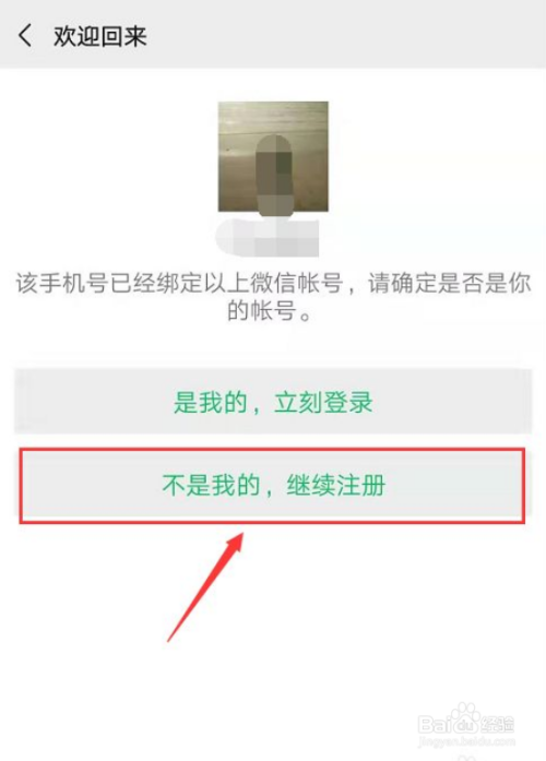 进入登录选择页面,如果想使用新的微信号,就点击【不是我的,继续注册】按钮即可有新的微信号。