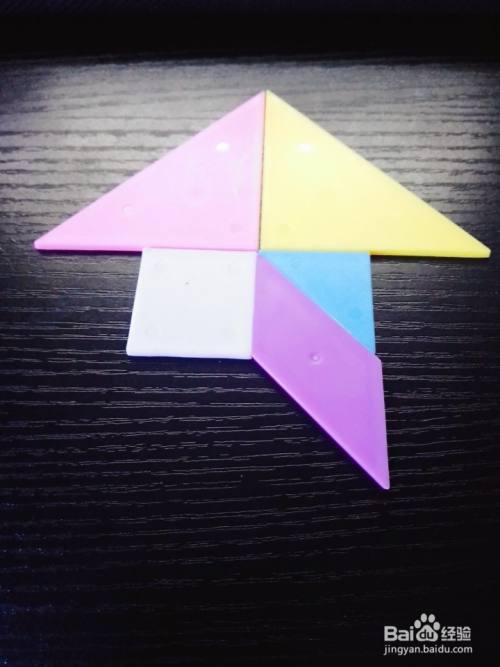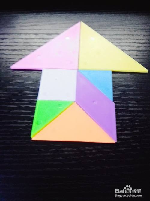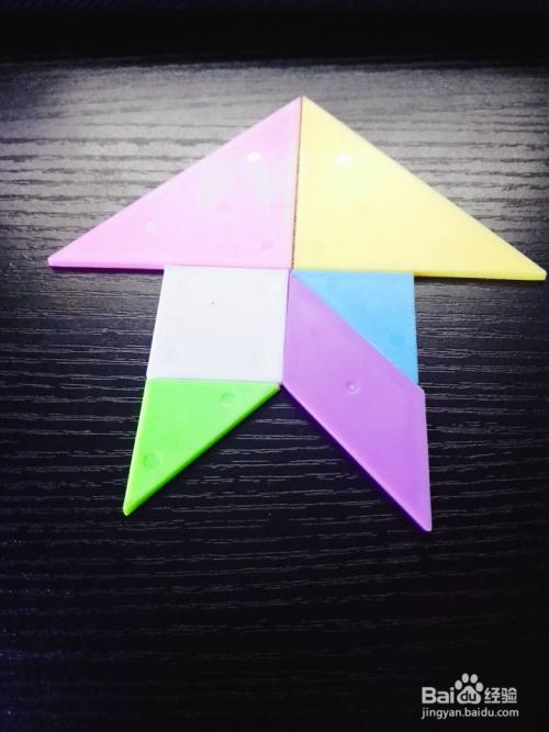 拿出一个紫色平行四边形板放在蓝色小号三角形板的下方,如图所示。