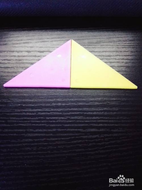 拿出一个黄色大号三角形板放在粉色大号三角形板的右边,如图所示。