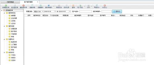在界面左侧导航树中按照服务单状态、服务类型、处理方式、回访状态等进行分类,点击后可以显示相应类别的客户服务单资料。