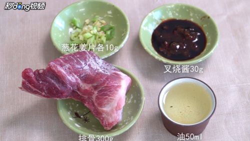 1食材展示:排骨300克、油50毫升、叉烧酱30克、葱花姜片各10克。