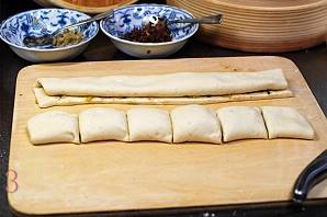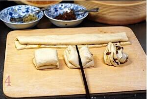 将面片卷成一个长条。如面片比较大,可在中间切开,方便整形。如果卷成一个长条后就这么上蒸笼蒸的话就叫“懒龙”拉!顾名思义。。。