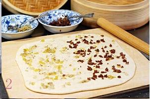 等待面团发酵的过程中,锅内倒入色拉油,油温后加葱花,盐和花椒胡椒粉炒香后,盛出。如做肉末花卷,将肉末也加盐、酱油等炒香后盛出即可。发好的面团擀成一张厚越0.5cm的大面片。因为炒好的葱花或肉末带油和咸味,所以不用加别的调味料了。