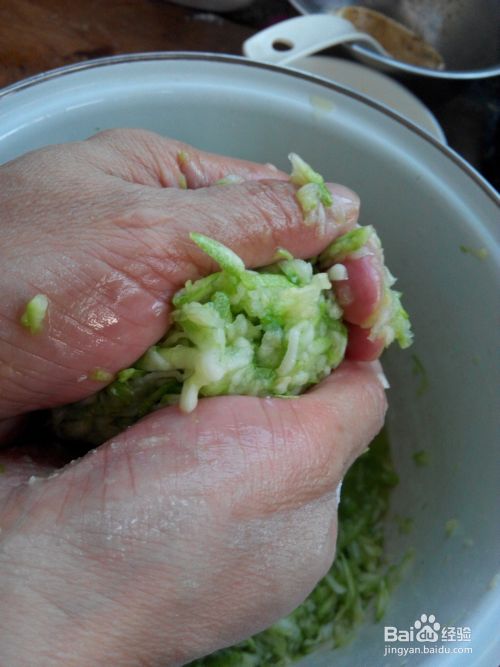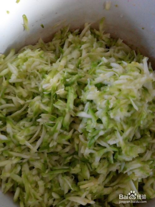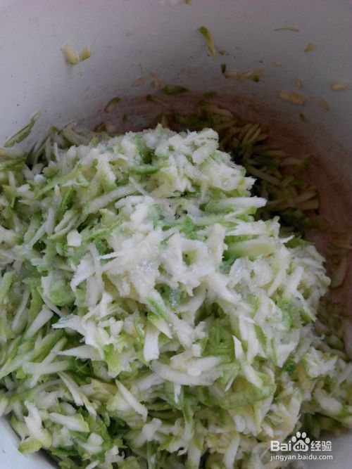 角瓜洗净,擦成馅,洒些盐,攥出水分。