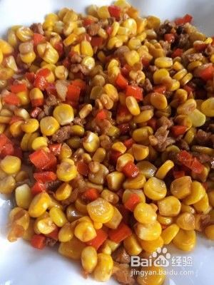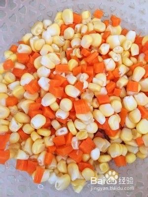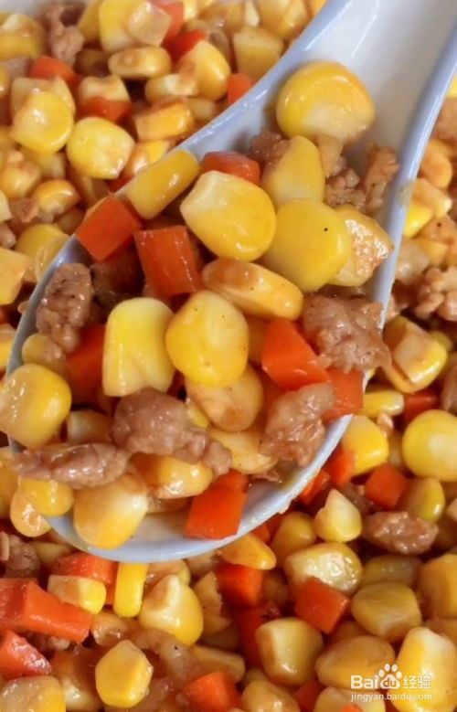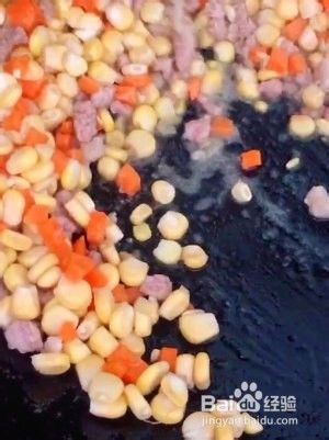 倒入胡萝卜丁和玉米粒,放入盐和酱油,炒熟