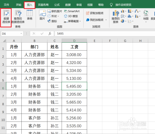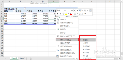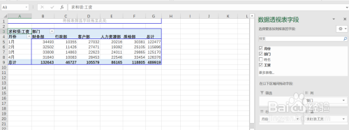 在本例子中,拖拽“月份”到“行字段”,“部门”为“列字段”,“工资”为“值字段”。可以得到每月各部门的工资费用表。
