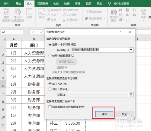 在弹出的对话框“创建数据透视表”中选择“确定”。