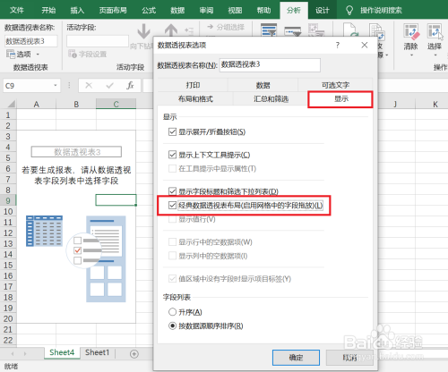 在弹出的对话框中选择“显示”,在“经典数据透视表布局”框中打钩,点击“确定”。