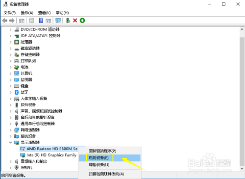 在设备管理器中首先点击显示适配器,在里面可以发现有两个显卡,我们先右键单击独立显卡--启用设备,如下图所示