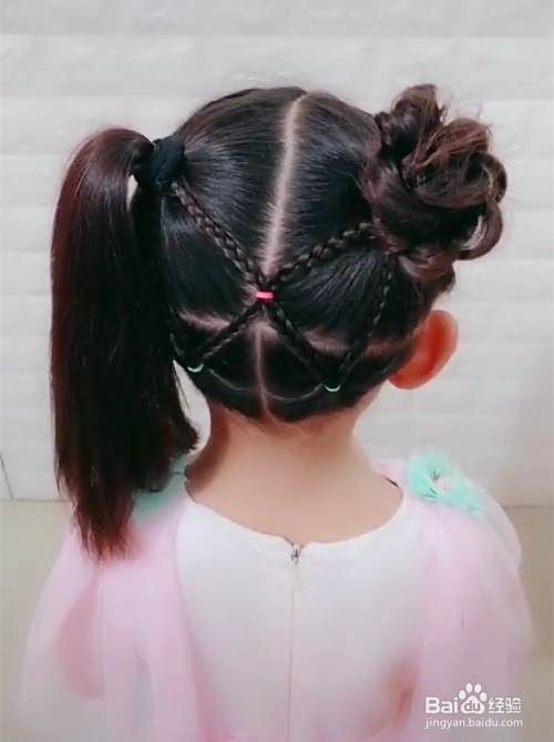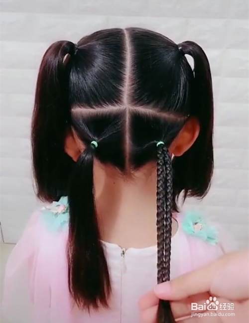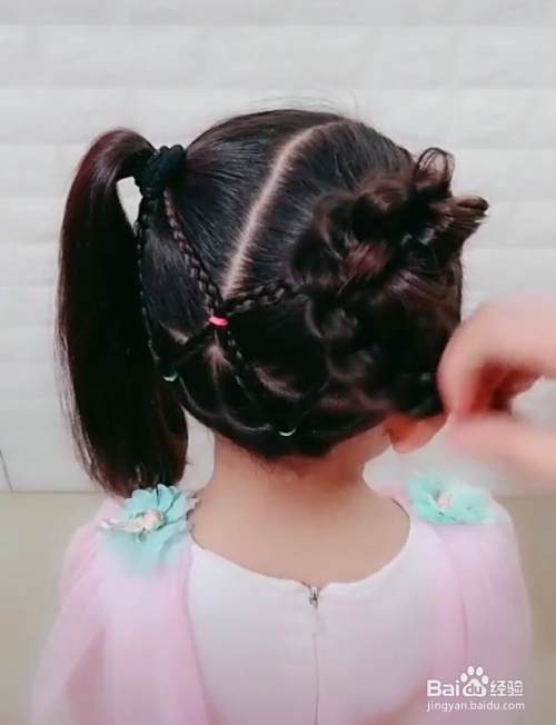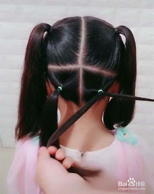 首先,把孩子头发梳理整齐,然后从耳朵上方开始画一条直线,耳朵上面的头发从中间分成两份,分别用皮筋固定好