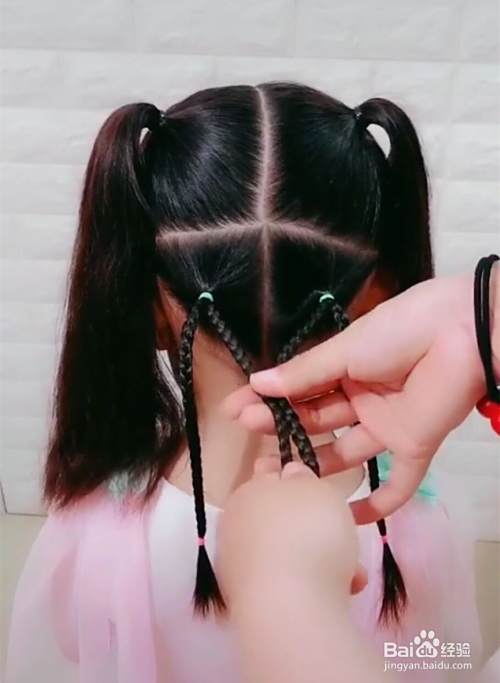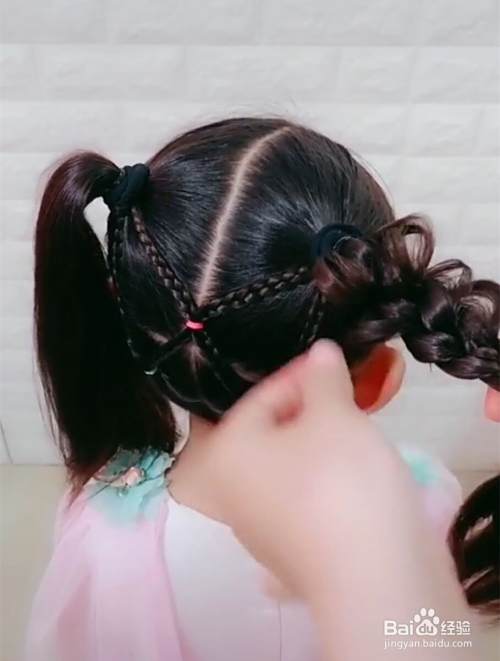 接着把下面这两个小辫子的右侧小辫子再分成两缕头发,然后分别编成麻花辫,用皮筋固定好尾部