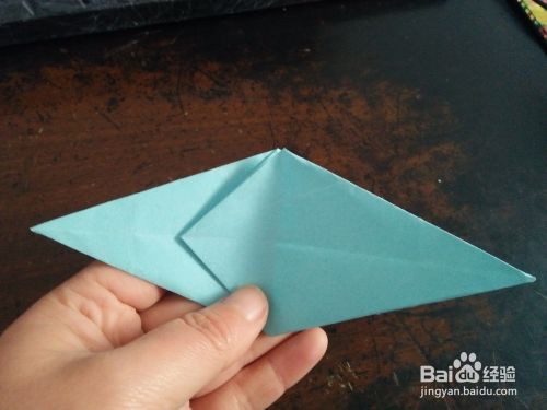翻到另一面后,把这一侧的角也向上折,和后边的对齐。再把左侧的角向下折,如图三。