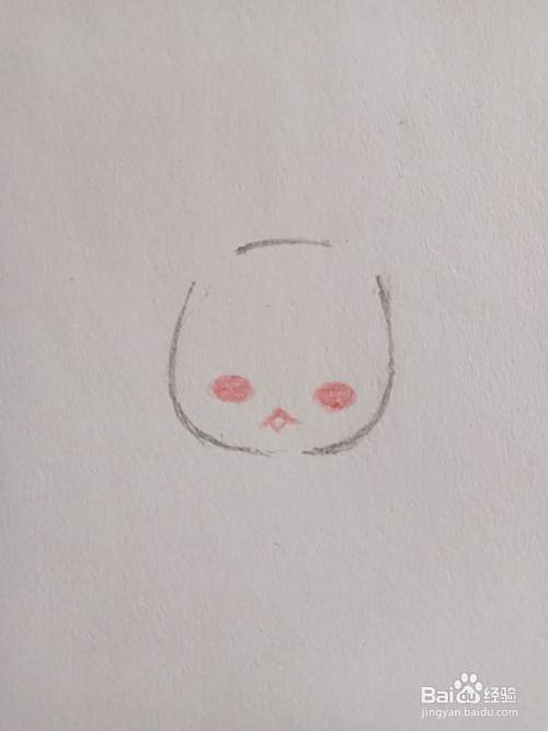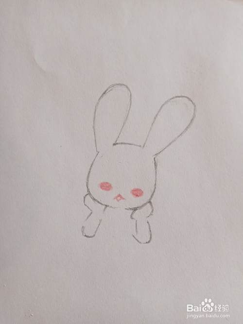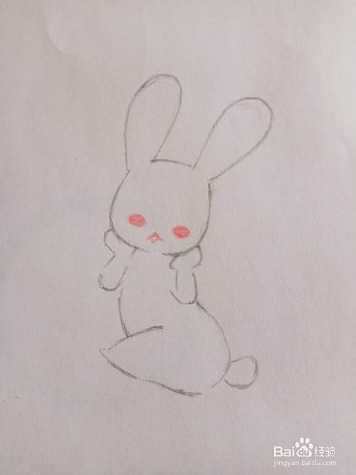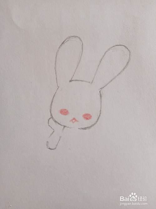 然后,再用红色铅笔将小白兔的嘴巴、眼睛画出来,要先画嘴巴定中心位置,然后画眼睛。