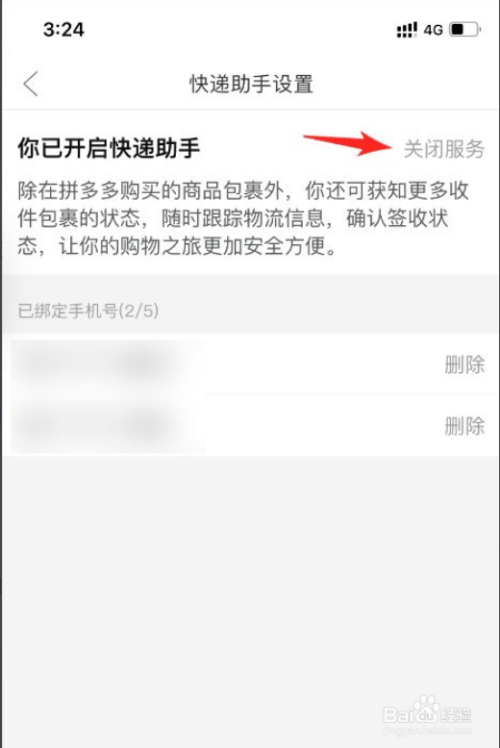 在快递助手设置页面里,点击况眠蕉“关闭服务”选项