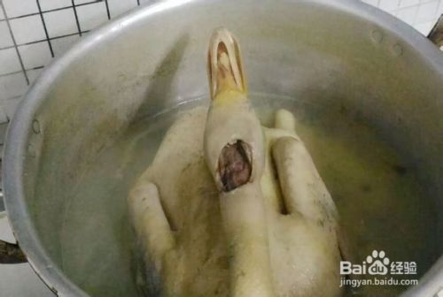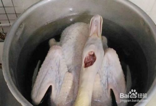 整个鸭子表面抹少量盐,放入锅里加清水大火烧开,中小火慢煮约30分钟,时间的长短要根据鸭的大小而定