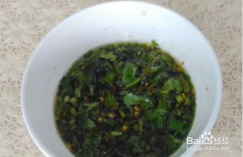 将生姜、大蒜、小葱、香菜切细剁碎,一起放入小碗中,调入花生油、酱油拌匀即可