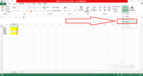 紧接着,让我们一起点击上方工具栏靠右边的排序和筛选后选择筛选并点击。