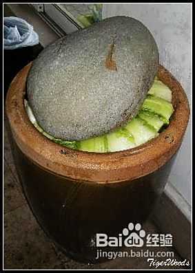 三四天后,往缸里倒水,水要漫过白菜,之后缸上盖上透气的大盖子。一个月后酸菜就腌好了。白菜的叶子黄了,有酸味了,就可以吃了。吃时随吃随取。