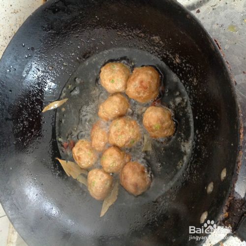 油炸丸子。锅中放入花生油,多放一点,最好能没过丸子的三份之二,热锅后加入葱花、香叶、八角爆香,倒入做好的丸子。