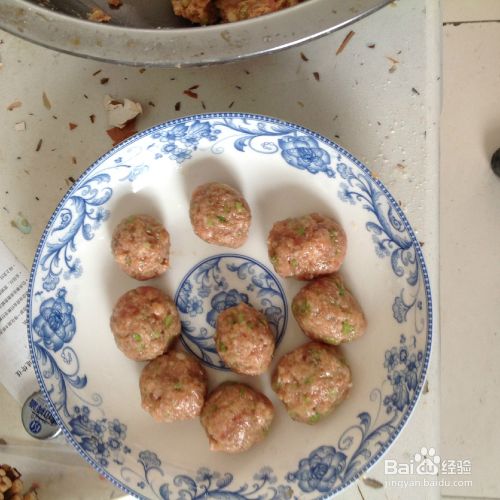 搓丸子。手洗净,涂上一层花生油,将调好的馅搓成适当大小的丸子,放入盘中备炸。