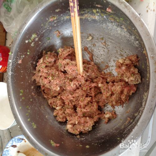 剁肉馅。将瘦肉和五花肉一起剁成肉馅。为了省事,可以在超市让售货员用机器绞好。芹菜切碎,将剁好的肉馅和芹菜用筷子搅拌在一起,搓入半个馒头。加入盐、酱油、少量花生油,充分搅拌。盐的用量可以根据自己口味添加。