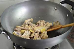 锅里热油,放入姜蒜爆香,倒入鸡块,大火翻炒