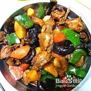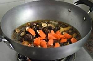 炒至鸡肉变色调入生抽、老抽、料酒炒至上色倒入清水,并放入香菇和胡萝卜