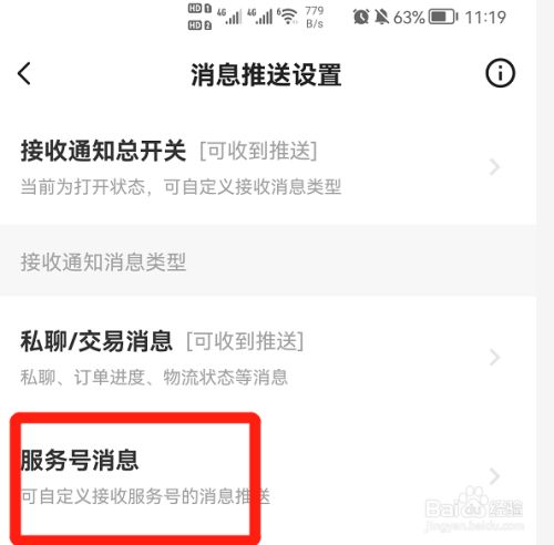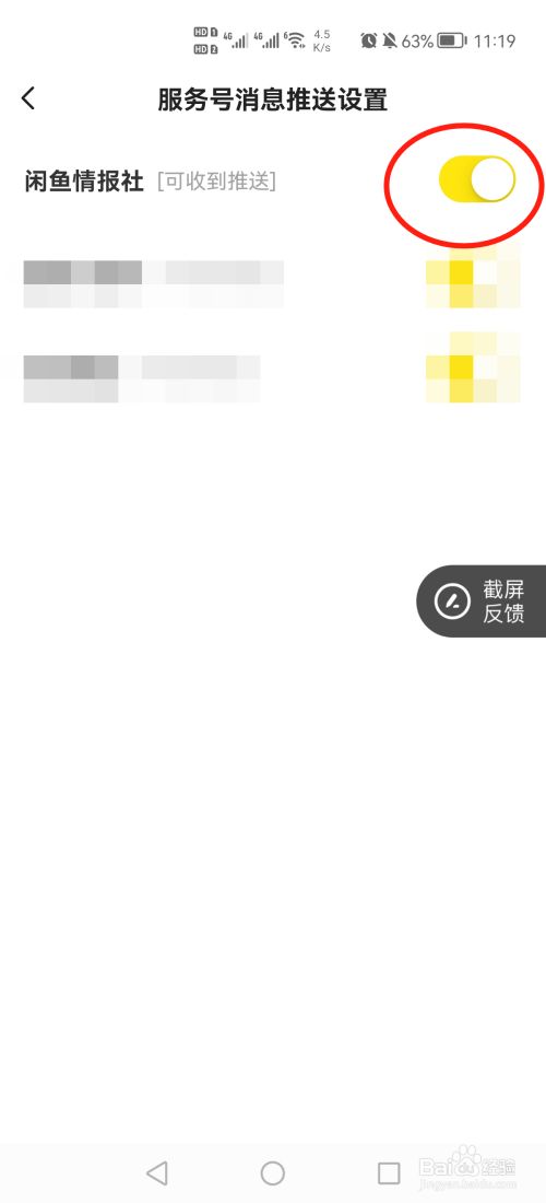 第四步,进入服务号消息推送设置页面之后,将“闲鱼情报社”后方的开关打开即可