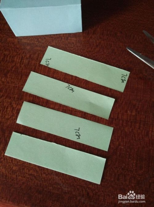 拿出一张7*7cm的正方形彩纸,对折再对折,用小刀把它分成4份大小一样的长条。