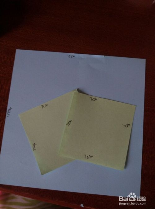 准备一张15*15.两张7*7的正方形彩纸。把15*15的正方形彩纸裁剪成两个长方形,如下图所示。