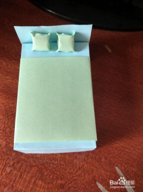 把剩下的一张正方形彩纸,2个边缘往内折0.5cm,放在床体上即可,这样一个简单精致的小床就出来了。