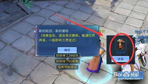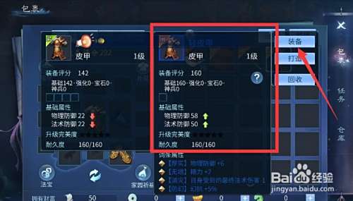 对话完毕我们就能得到任务奖励了,奖励了一件衣服,我们打开包裹,可以查看奖励品和身上装备的对比属性,奖励的皮甲属性非常好