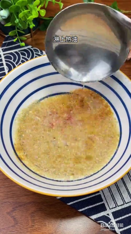 我们在碗中加入葱花,小米辣,蒜末,白芝麻,辣椒粉,烧热油浇在上面,浇出香味
