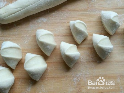 3.切出剂子,擀成皮子,放入雪菜馅,包好即可。