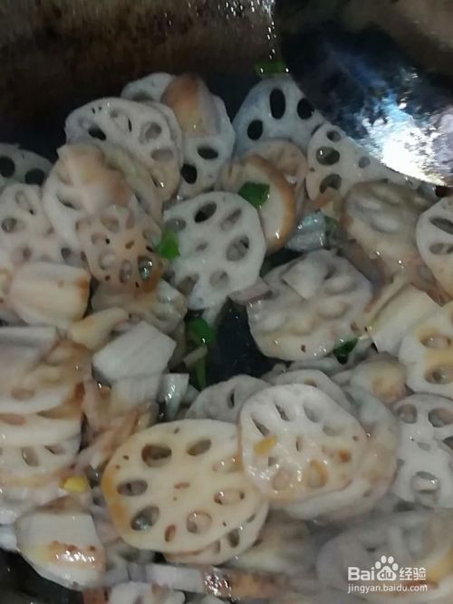 第五,煸炒几下姜丝,迅速把藕片放进去,大火烧锅,迅速翻炒,动作要迅速点,放入醋,要多放点,翻炒一下。