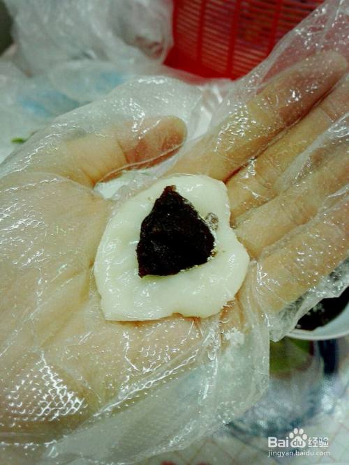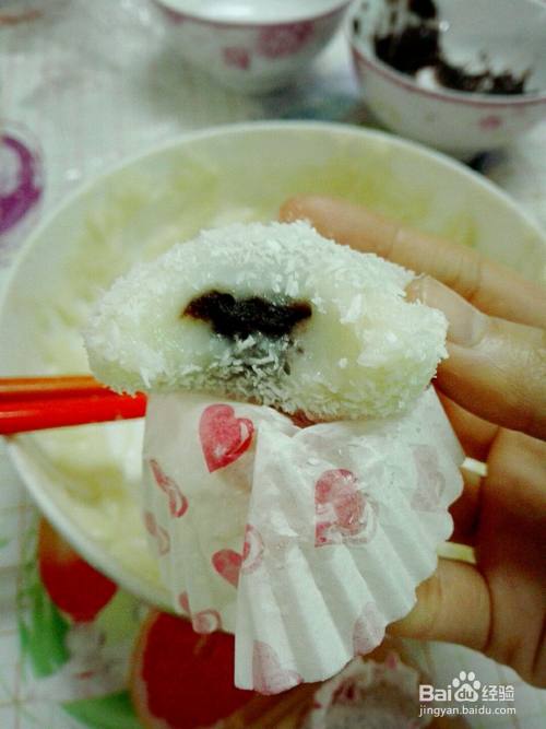 带上一次性手套,用筷子挑起,按扁后,中间凹陷,装入红豆沙,像包子一样包起来,再放到椰蓉里面翻滚,确保沾满椰蓉。