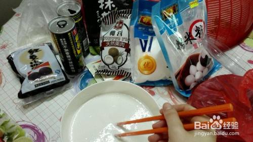 材料如图,把粉类(糯米粉,玉米淀粉,椰汁,白砂糖)全都按比例倒进去,搅拌均匀,面粉要完全熔化噢,最后加入油,继续搅拌,均匀粘稠为止。