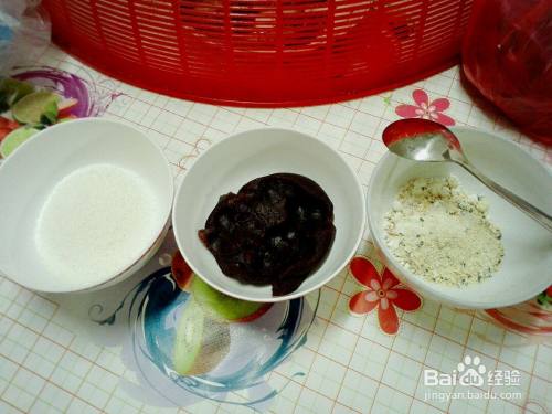 弄好后,拿去蒸,另一边就可以开始准备红豆沙和花生芝麻粉了,另外把椰蓉也装好备用。建议用碗装椰蓉,一个一个弄,不然很浪费椰蓉的同时,糯米糍还容易黏在一起。