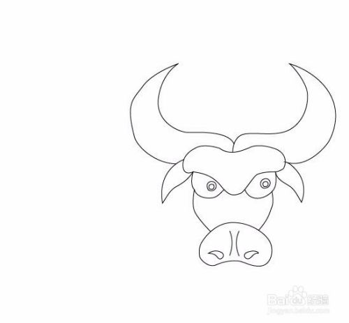 在眼睛内画出大牤牛的两只眼睛,然后再在头部上画出大牤牛的两只耳朵,如图所示: