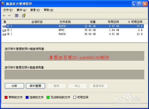 在上面选择对应的磁盘,如C盘、D盘、E盘,然后点左下方的“碎片整理”按键就开始碎片整理了,碎片整理比较慢,比较耗时,建议再睡觉时进行,另外我们在进行碎片整理时,尽量关闭其它所有的程序:一时别的软件需要磁盘操作,可能产生新的碎片,而是影响碎片整理的速度。
