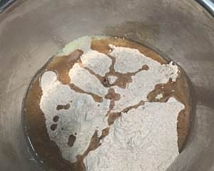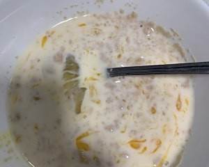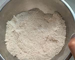 椰子油加入粉类中用手指将椰子油搓散成粗玉米粉状,好好搓。