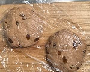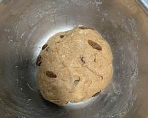 将面团在盆里压一下,撒上葡萄干,将面团折叠几次后,让葡萄干均匀分布。(也要戴手套)