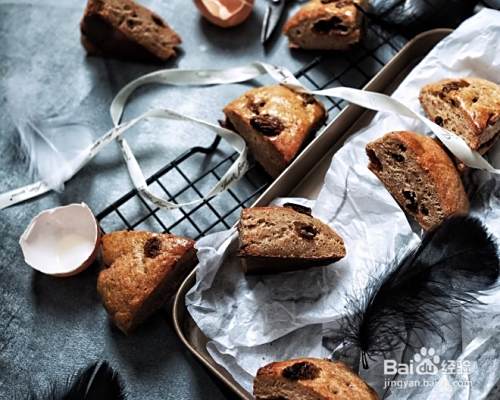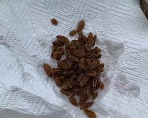 葡萄干用清水浸泡五分钟,洗干净,用厨房纸吸干表面水份,备用。