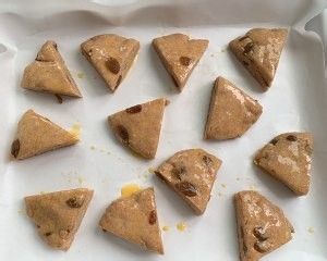 第二天取出冷藏面饼,室温静置发酵30-40分钟(室温25度左右),每个圆饼分割成6份。一共12个司康。